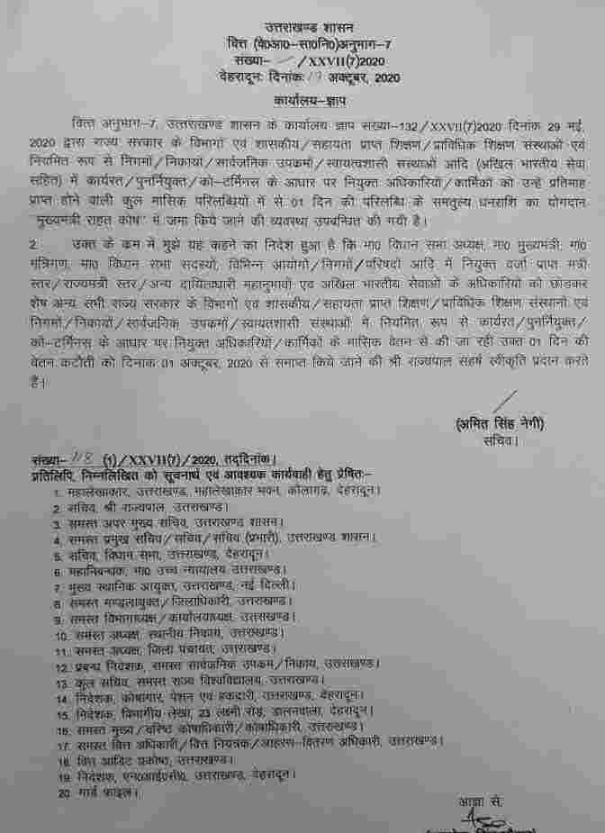 इस कटौती को एक साल तक जारी रखने के निर्देश दिए गए थे, लेकिन कर्मचारियों की नाराजगी को देखते हूवे राज्य कैबिनेट ने कर्मचारियों के वेतन से हो रही कटौती पर रोक लगा दी । आगे देखिए आदेश….