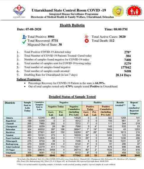 Uttarakhand Covid-19 Latest Update for 7 August 2020, Coronavirus in Uttarakhand. उत्तराखंड में शुक्रवार को 278 नये कोरोना संक्रमण के मामले सामने आ गये, इसके बाद राज्य में अब तक मिले कुल कोरोना संक्रमितों की संख्या 8901 हो गयी है, इसमें से 5731 लोगों का इलाज कर लिया गया है। राज्य में अभी तक 112 कोरोना संक्रमित मरीजों की मौत हो चुकी है, पिछले 24 घंटे में राज्य में 8 कोरोना संक्रमित मरीजों की मौत हो गई है। शुक्रवार को सामने आये मामले जिलावार इस प्रकार हैं….