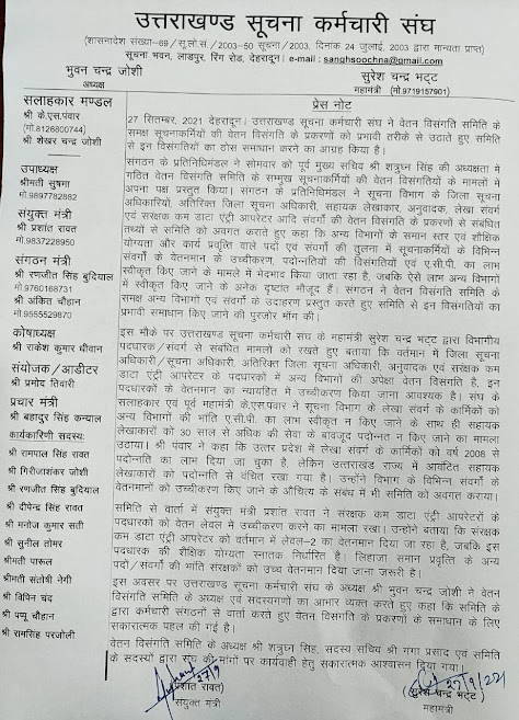 27 सितम्बर, 2021 देहरादून। उत्तराखण्ड सूचना कर्मचारी संघ ने वेतन विसंगति समिति के समक्ष सूचनाकर्मियों की वेतन विसंगति के प्रकरणों को प्रभावी तरीके से उठाते हुए समिति से इन विसंगतियों का ठोस समाधान करने का आग्रह किया है। संगठन के प्रतिनिधिमंडल ने सोमवार को पूर्व मुख्य सचिव शत्रुघ्न सिंह की अध्यक्षता में गठित वेतन विसंगति समिति के सम्मुख सूचनाकर्मियों की वेतन विसंगतियों के मामलों में अपना पक्ष प्रस्तुत किया। संगठन के प्रतिनिधिमंडल ने सूचना विभाग के जिला सूचना अधिकारियों, अतिरिक्त जिला सूचना अधिकारी, सहायक लेखाकार, अनुवादक, लेखा संवर्ग एवं सरंक्षक कम डाटा एंट्री आपरेटर आदि संवर्गों की वेतन विसंगति के प्रकरणों से संबंधित तथ्यों से समिति को अवगत कराते हुए कहा कि अन्य विभागों के समान स्तर एवं शैक्षिक योग्यता और कार्य प्रवित्त वाले पदों एवं संवर्गों की तुलना में सूचनाकर्मियों के विभिन्न संवर्गों के वेतनमान के उच्चीकरण, पदोन्नतियों की विसंगतियों एवं ए.सी.पी. का लाभ स्वीकृत किए जाने के मामले में भेदभाव कियाजाता रहा है, जबकि ऐसे लाभ अन्य विभागों में स्वीकृत किए जाने के अनेक दृष्टांत मौजूद हैं।