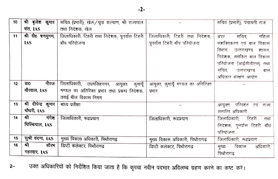 आईएएस अरविंद सिंह ह्यांकी को कुमायूं आयुक्त बनाया गया है, आईएएस दीपेंद्र चौधरी को कमिश्नर परिवहन और आईएएस मंगेश घिल्डियाल को जिलाधिकारी टिहरी बनाया गया है। आईएएस वंदना को जिलाधिकारी रुद्रप्रयाग का चार्ज दिया गया है। आगे देखिए पूरी लिस्ट….